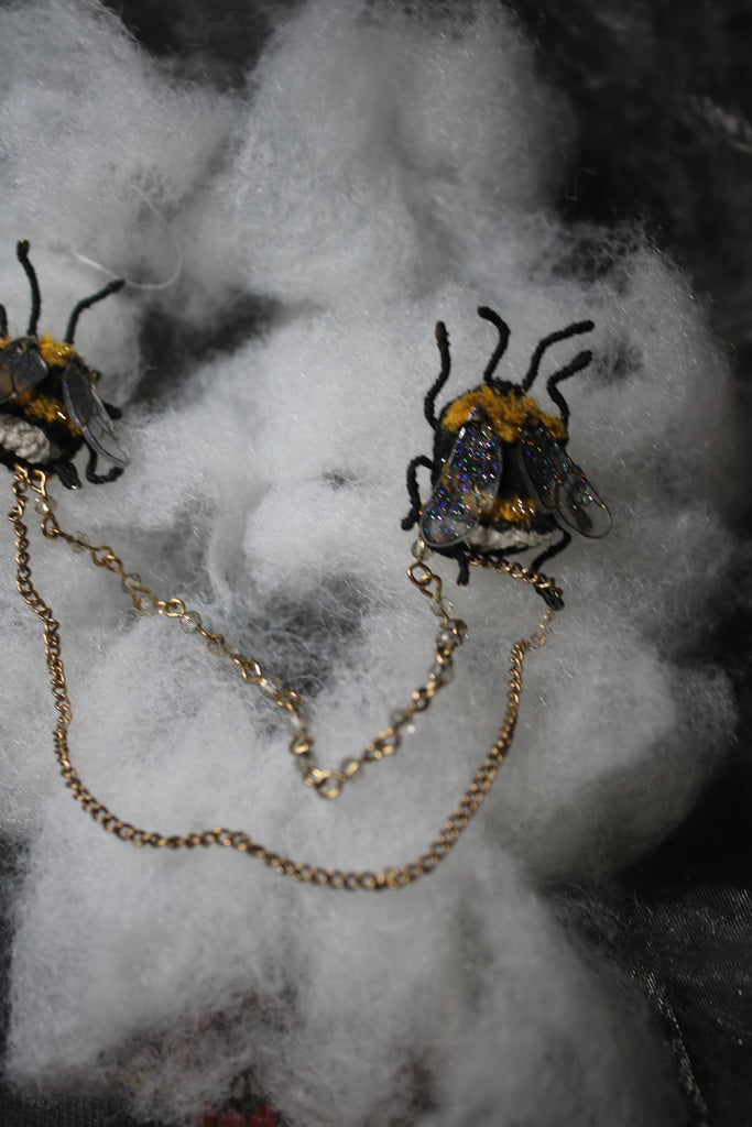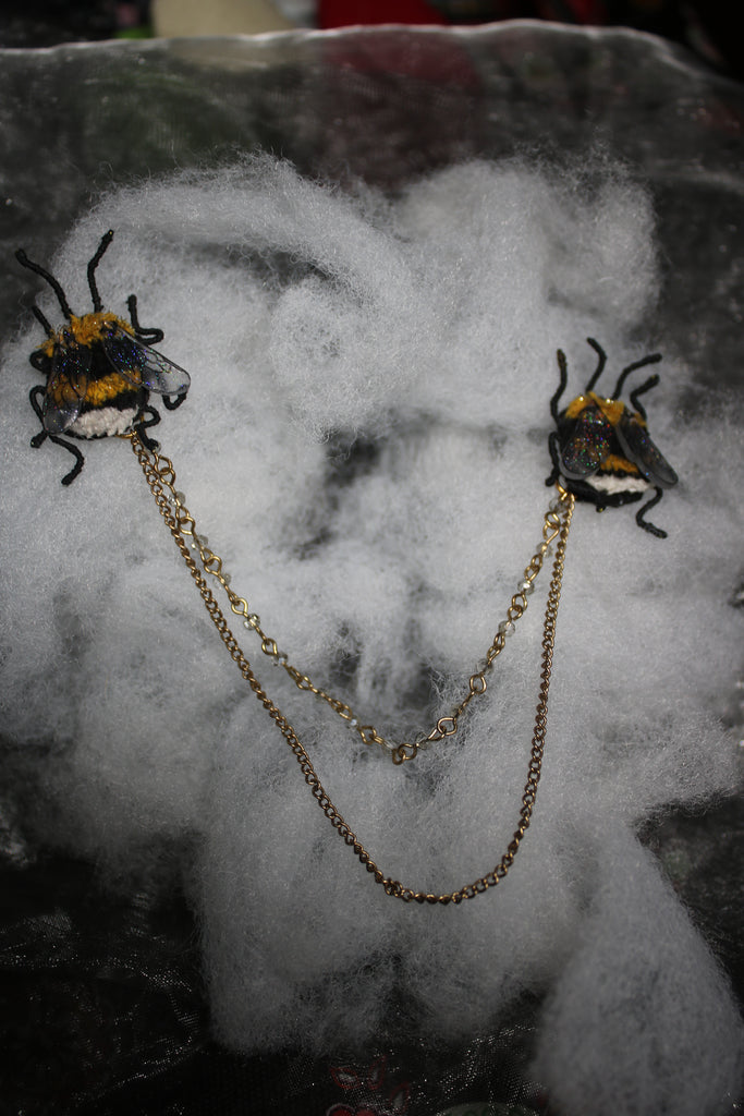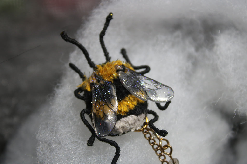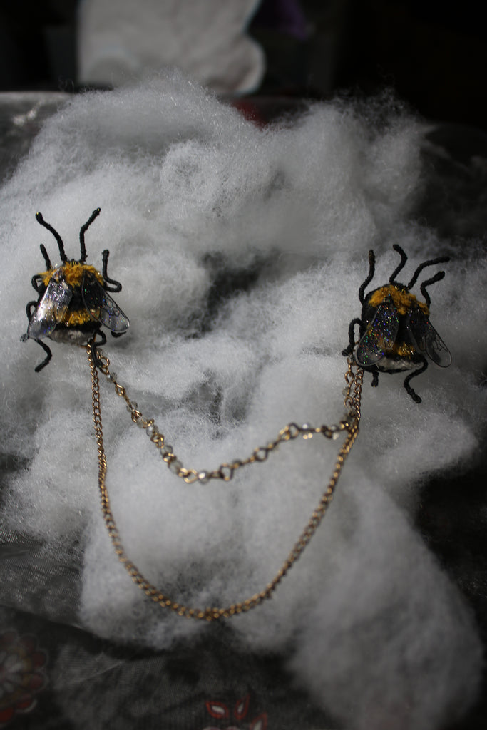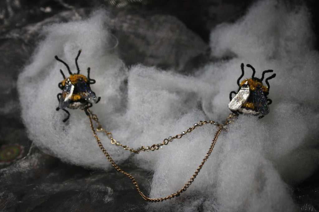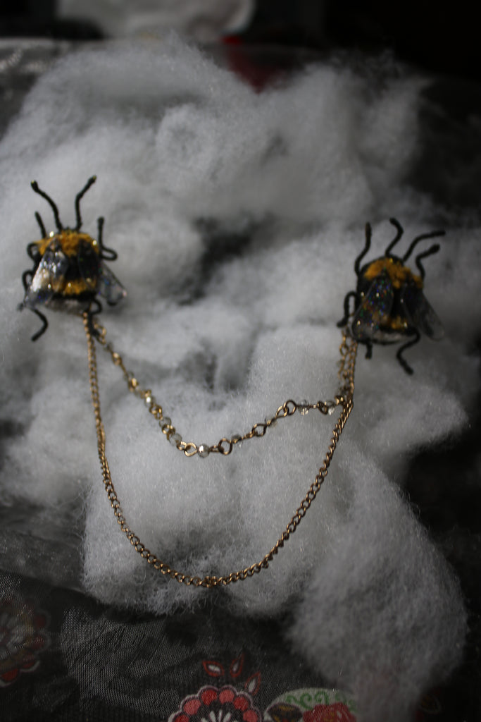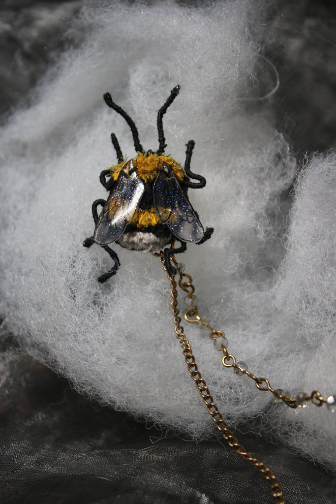 Bijou de col brodée main en fil coton et paillette. Plastique fou et gel uv pour les ailes et fil de fer pour les pattes.