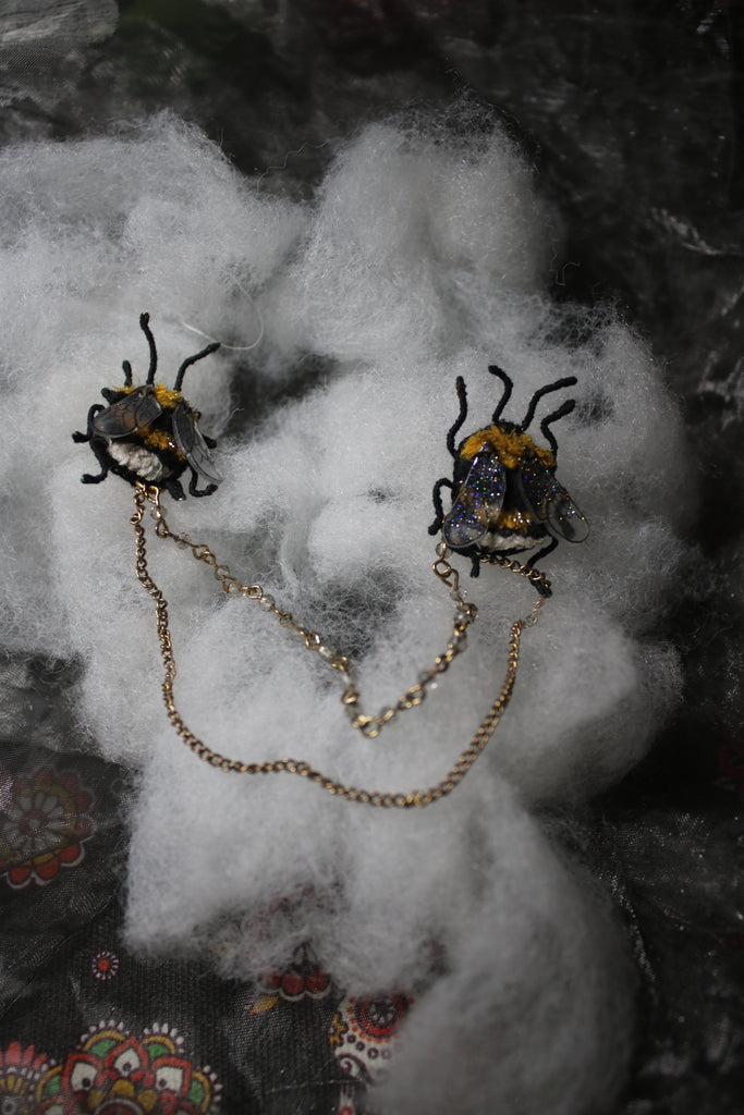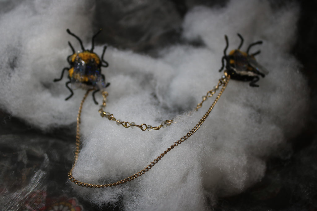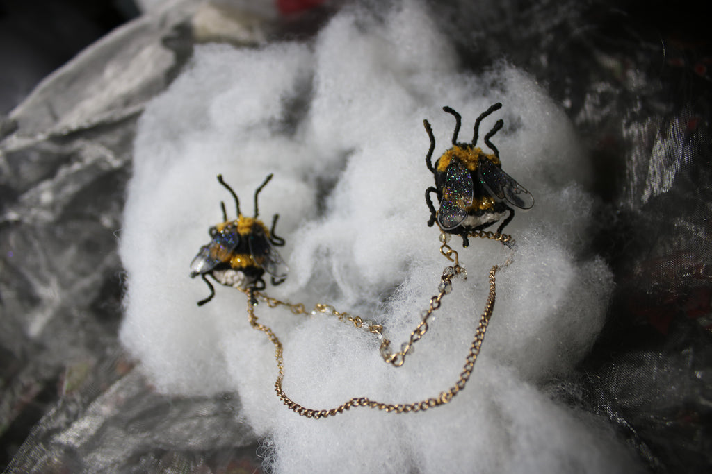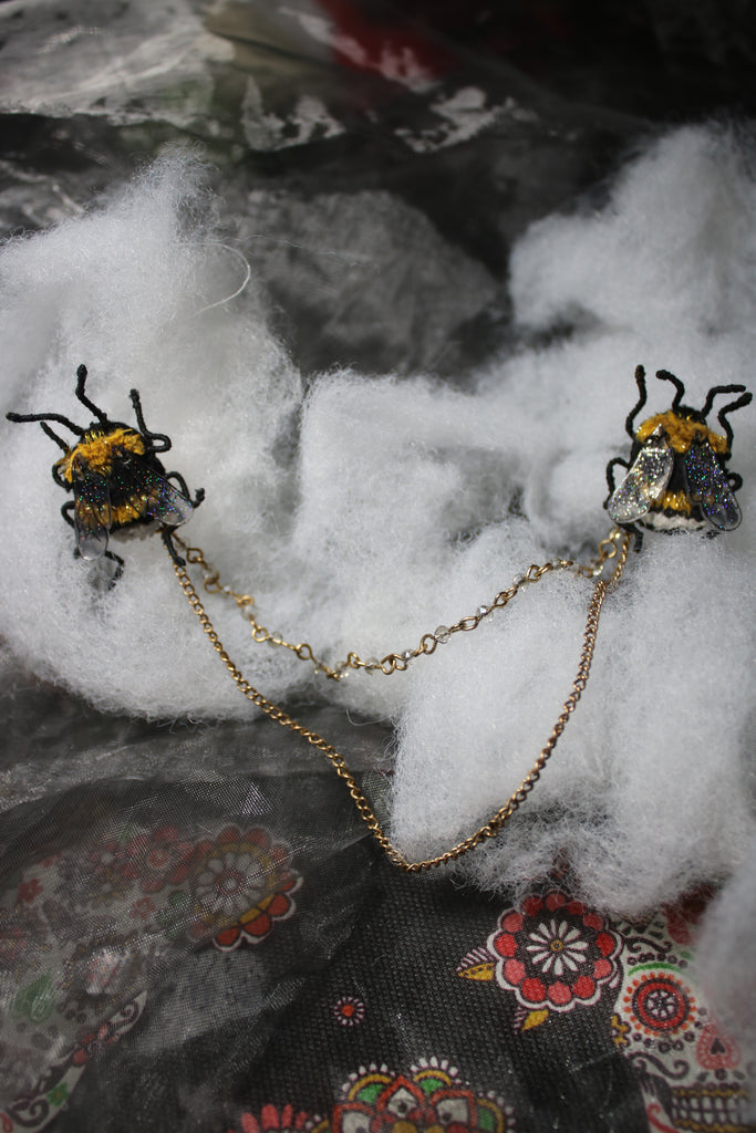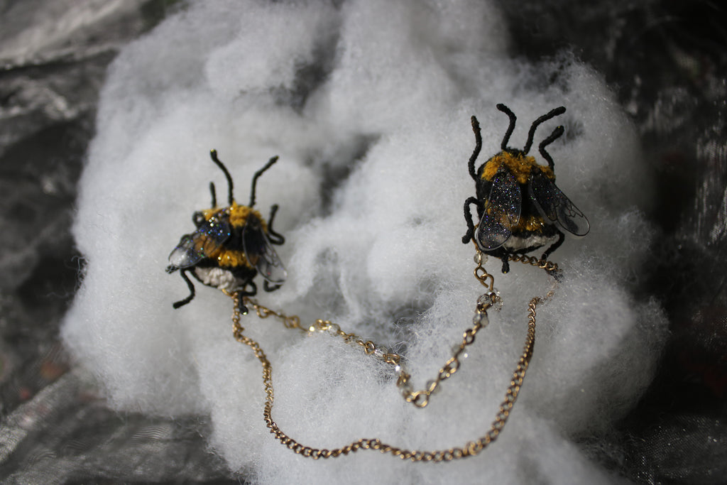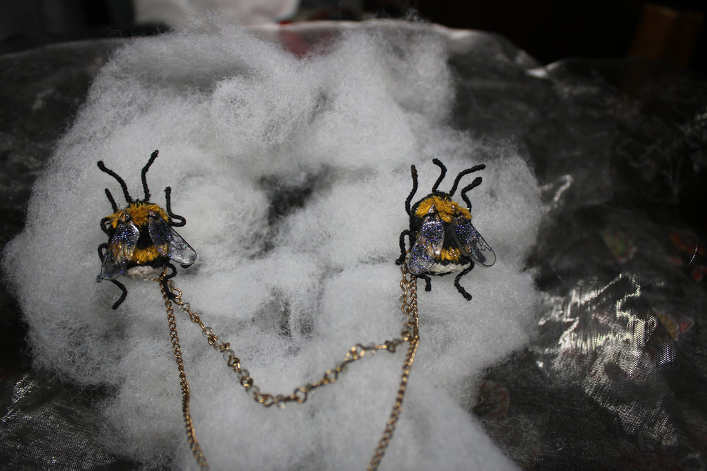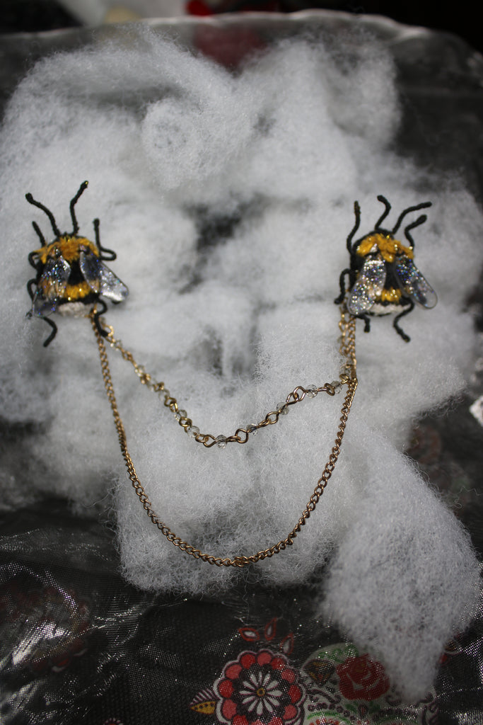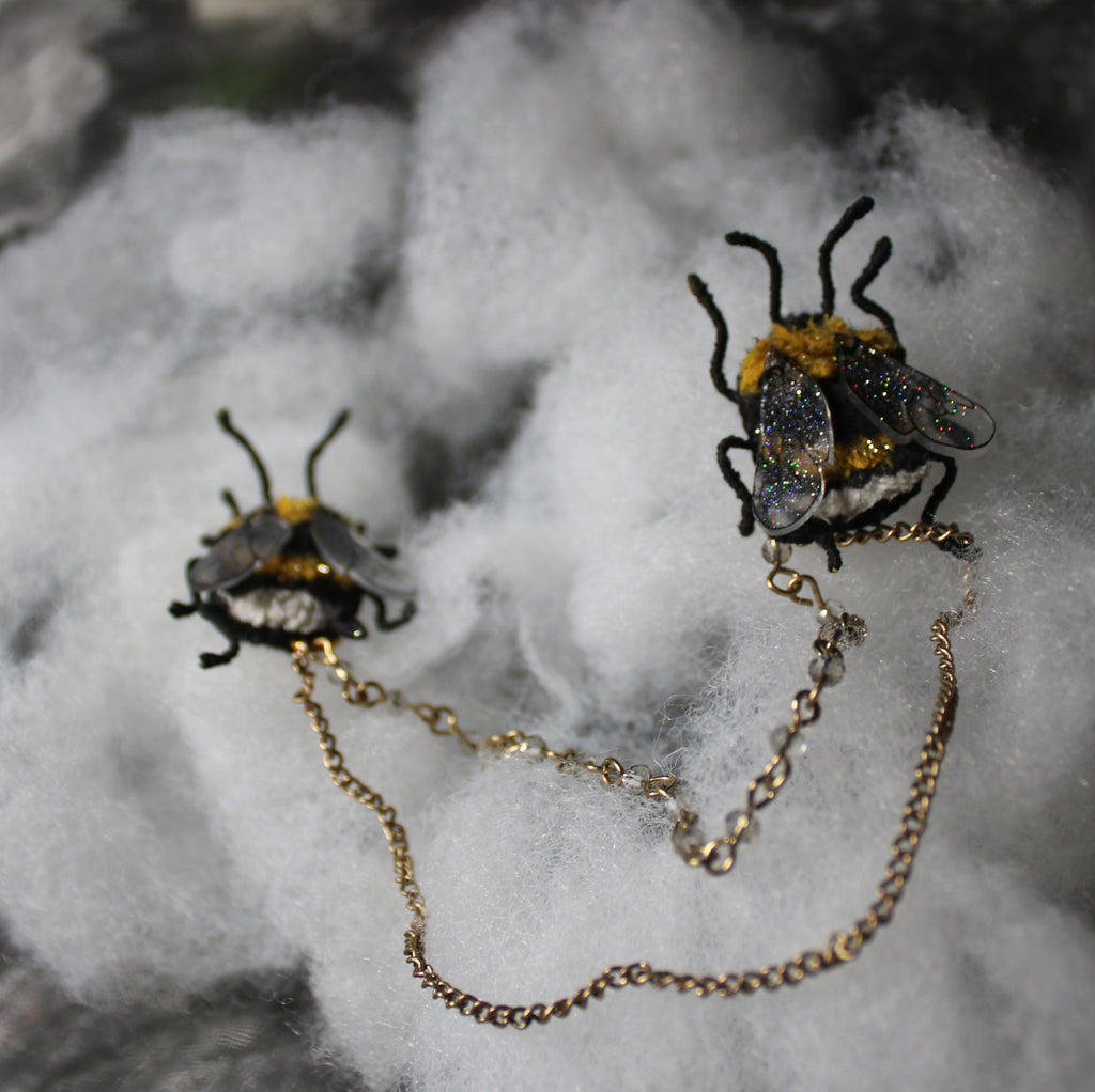Bijou de col brodée main en fil coton et paillette. Plastique fou et gel uv pour les ailes et fil de fer pour les pattes.